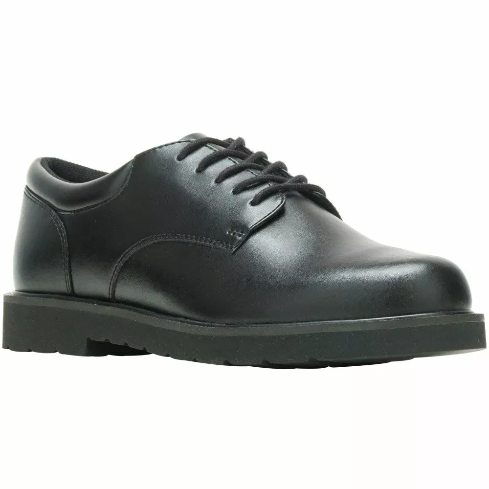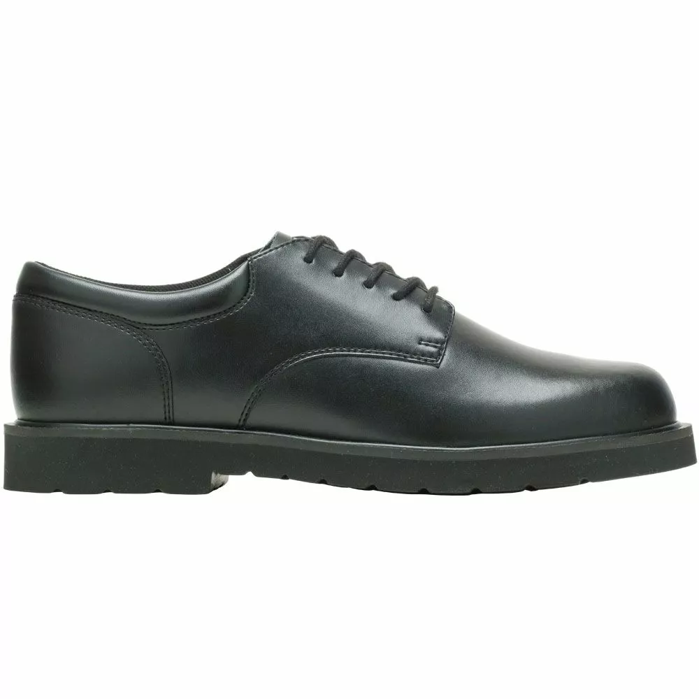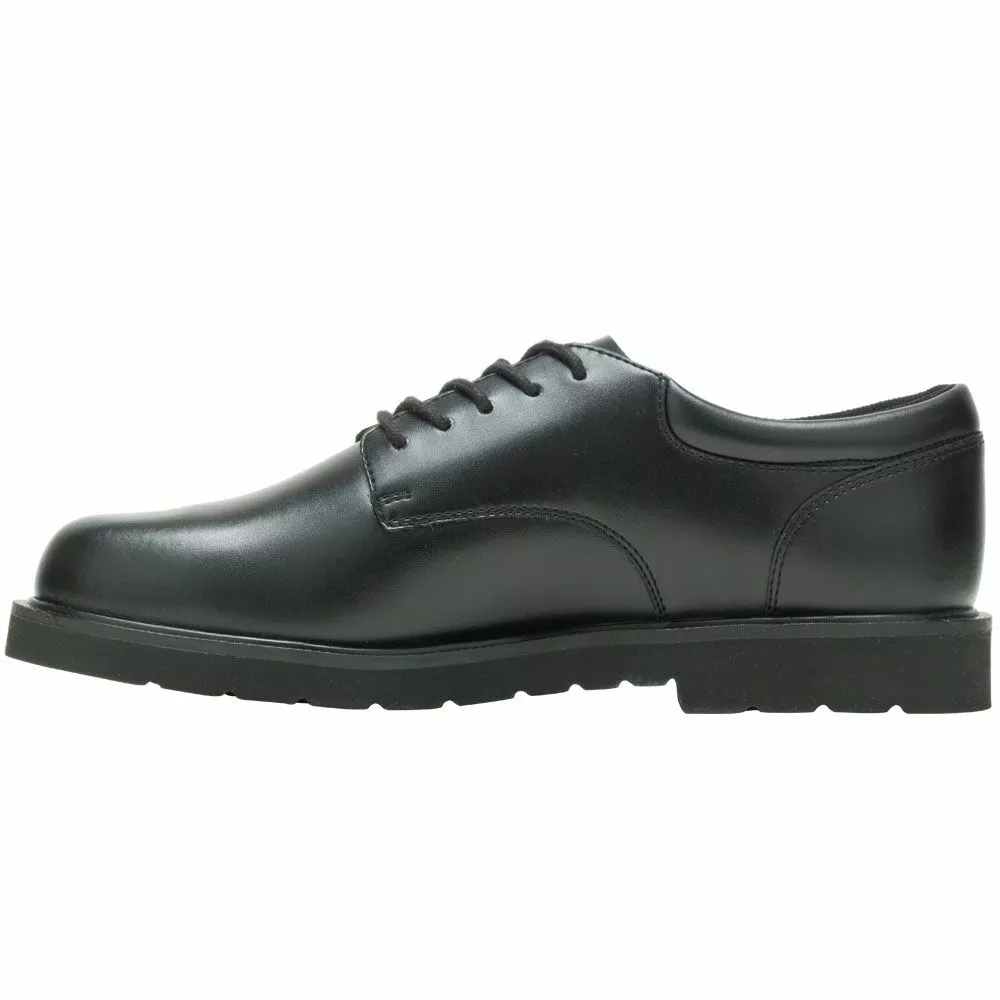 Bates High Shine Duty Ox Mens Non-Safety Toe Work Shoes. Versatile and reliable, these mens duty shoes are the perfect go-to for a day in the office or out in the public. These flexible Oxfords feature a high-gloss finish that complements a uniform or personal wear. They are designed to keep feet comfortable and provide traction, ensuring you can focus on the job. Constructed without metal, they are an ideal shoe for quickly passing through security checks.