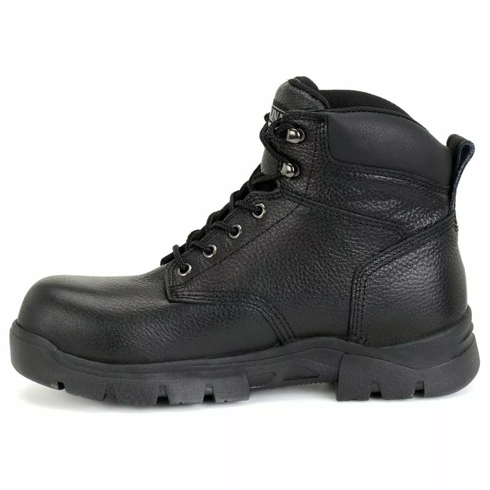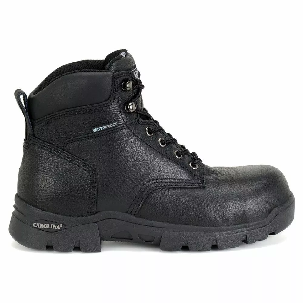 Carolina Black Circuit Mens Composite Toe Work Shoes. A black buff pebble grain leather upper paired with a composite safety toe to keep your feet comfortable and safe. This boot has an oil and slip-resistant rubber outsole and will keep your feet dry with the waterproof SCUBALINER. A composite toe meeting ASTM Standards and an electrical hazard rating promotes safety and reliability.