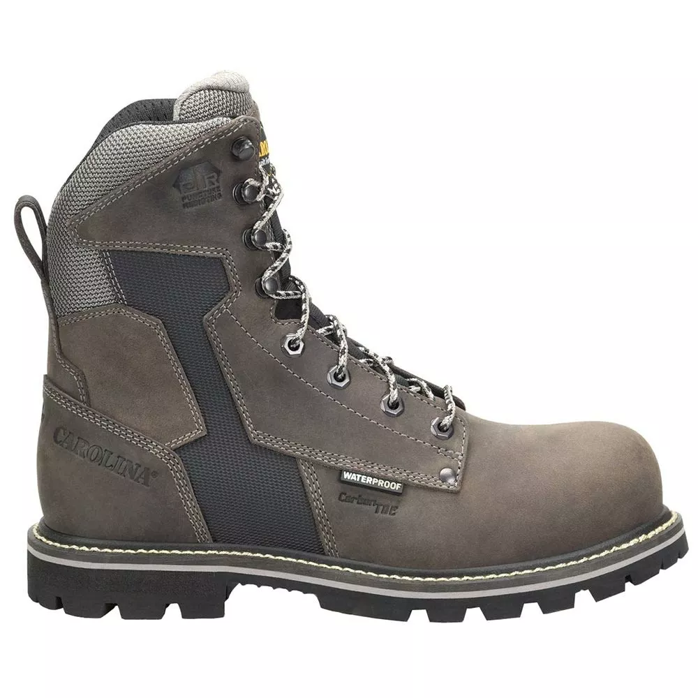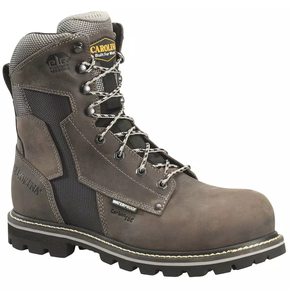 Carolina I-Beam Composite Toe Work Boots – Mens. Carolina’s I-Beam mens composite toe work boots sport rugged looks and deliver the performance to match. Saddleback Steeple Gray leather uppers with SCUBALINER waterproofing keep your feet dry throughout your entire shift. Mesh inner linings and removable AG8 polyurethane dual-density foam footbeds deliver all-day comfort. A triple-rib steel shank provides added stability, while an oil- and slip-resistant outsole gives you traction on slick surfaces.