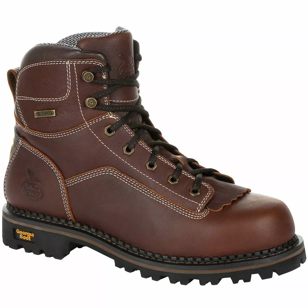 Georgia Boot Gb00270 Non-Safety Toe Work Boots – Mens. Georgia Boot’s Amp LT Logger Low Heel Waterproof Work Boot was made to go the distance. The Amp LT Logger’s construction includes a full-grain leather upper treated with signature Georgia Waterproof protection. Comfort-focused features include a cushioned EVA midsole, a padded collar, high-performance mesh lining and an AMP LT insole crafted with a polyurethane footbed and a memory foam layer.