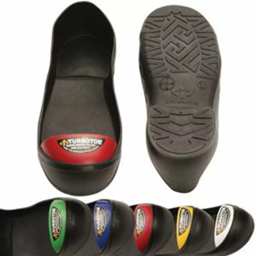 The Turbotoe protects the toe area from accidental impact, crushing or stubbing without having to spend big bucks on a pair of safety toes. These overshoes are made of flexible, pliable PVC while treads under sole to prevent slipping and help liquid flow away from the foot. These are ideal for any work environment that carries a risk of toe damage or has a steel toe cap requirement and is perfect for visitors, casual, temporary workers, management, clerical staff and sales people. Impacto Turbo Toe Overshoes will not harden, stiffen or crack and can be comfortably worn over low-heel dress, running shoes, and most boots.