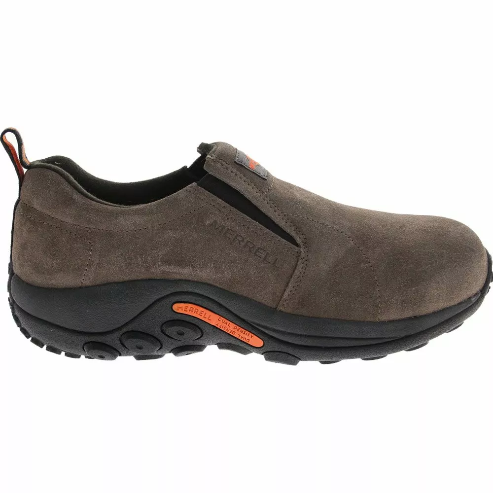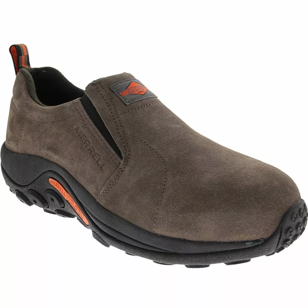 Merrell Work Jungle Moc Low Safety Toe Work Shoes – Mens. Transition between varied professional environments with confidence in the protective Merrell Safety Toe Jungle Moc. This suede leather offering is fully waterproofed and features a contoured COMFORTBASE footbed for breathable, foamy comfort. The Mark II-tested rubber outsole stops slips and handles oily surfaces with confidence, while also resisting heat exposure up to 500°F.