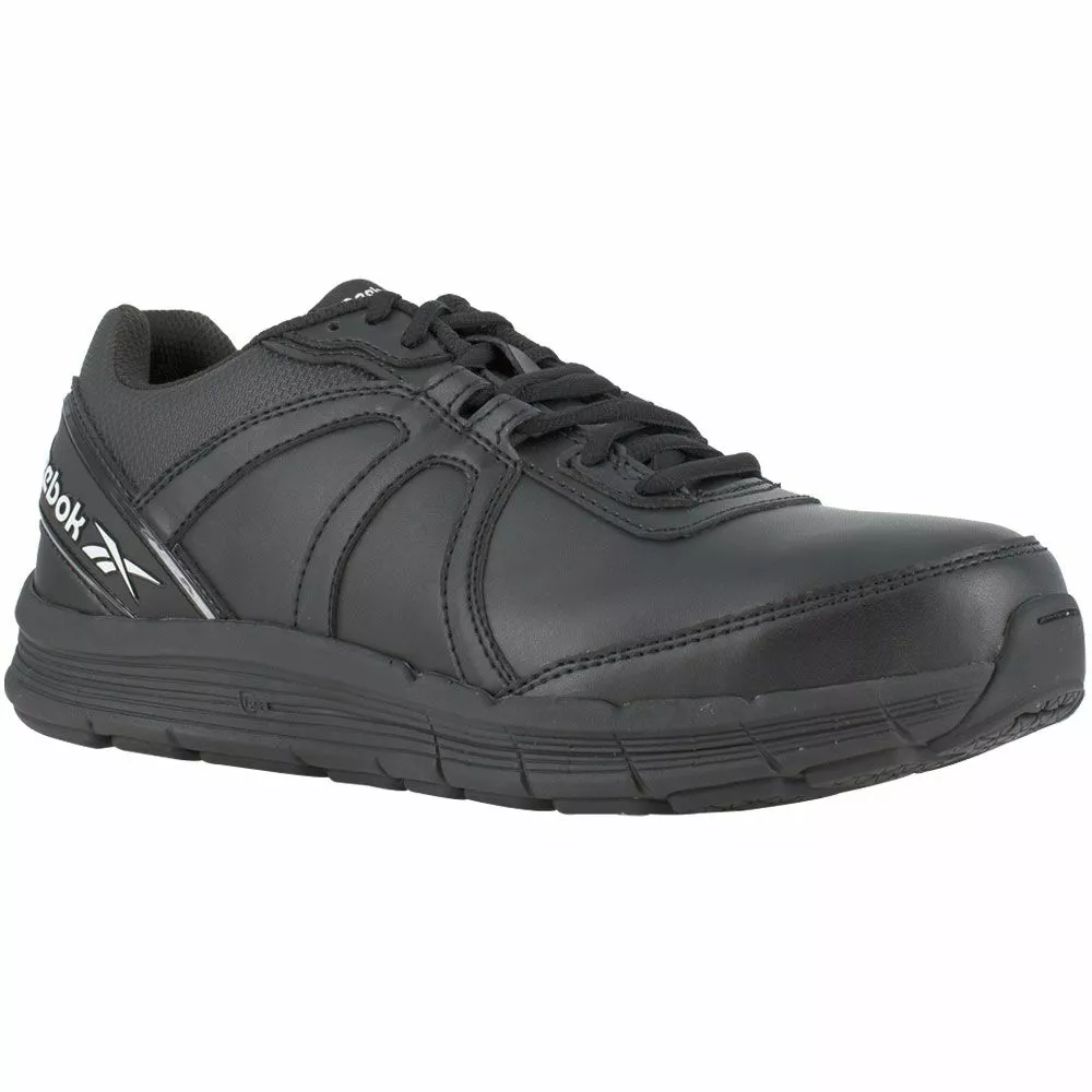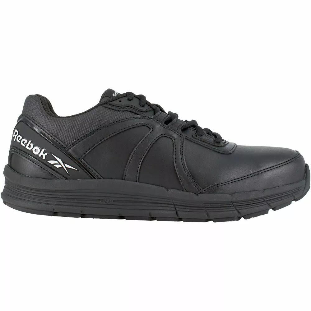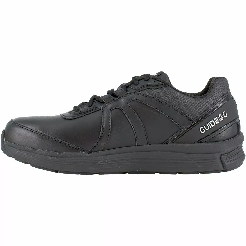 Reebok Work Rb3501 Mens Steel Toe Work Shoes. Made with a durable leather upper and lined with moisture wicking nylon mesh, the Reebok Guide Work RB3501 is a pair of mens steel toe work shoes designed to keep you quick on your feet the whole work day. The R52 rebound foam midsole absorbs shock with every step you take while the steel protective toe keeps your feet shielded from harm. The external TPU heel counter wraps around the shoe to ensure a great fit and improve your stability as you move.