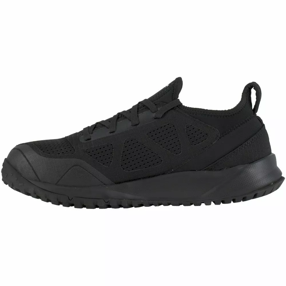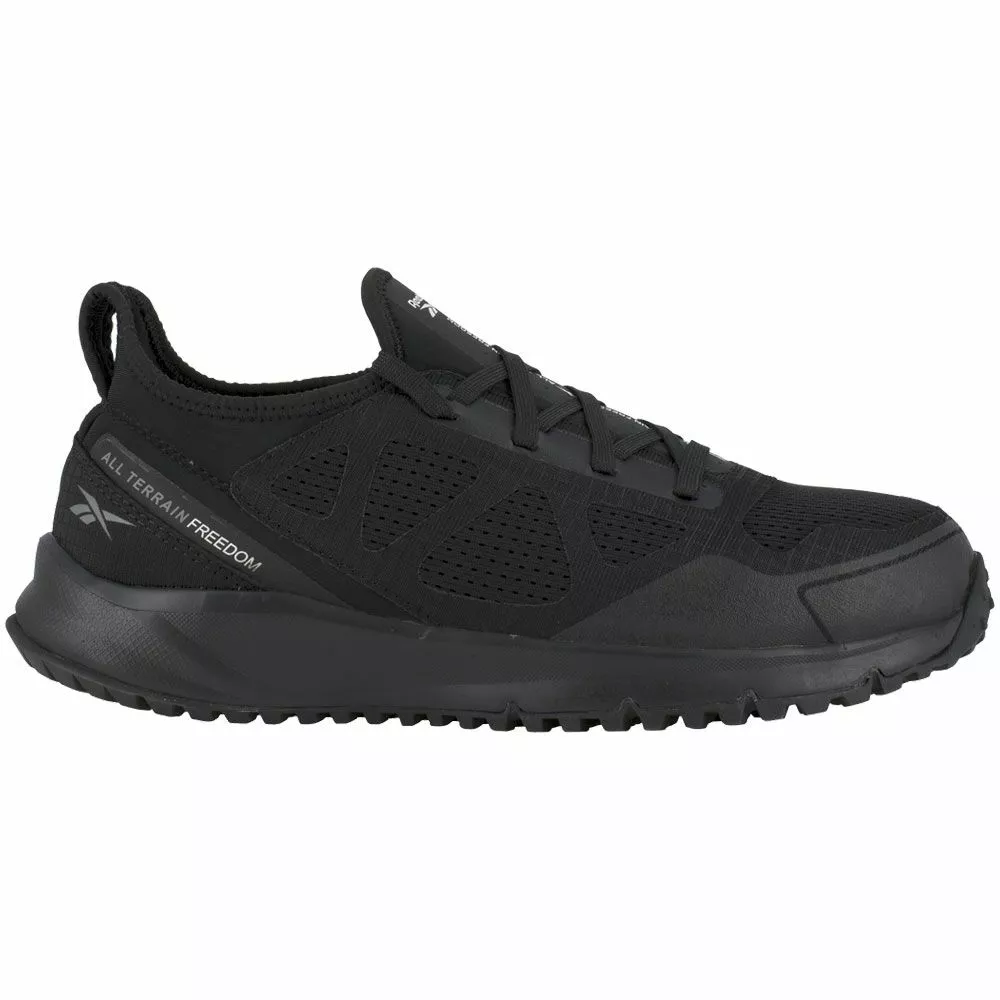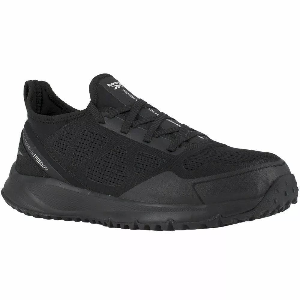 Reebok Work Rb4090 Mens Steel Toe Work Shoes. Rugged but comfortable, the Reebok All Terrain Work RB4090 will take you anywhere you need to go no matter the terrain. Black mesh and ripstop leather uppers provide durability and flexibility while the seamless neoprene lining helps keep your feet clean and dry. These mens steel toe work shoes will protect your toes from compression and impact, and a slip resistant rubber outsole with trail lugs and flex grooves will keep you on your feet no matter where you go.