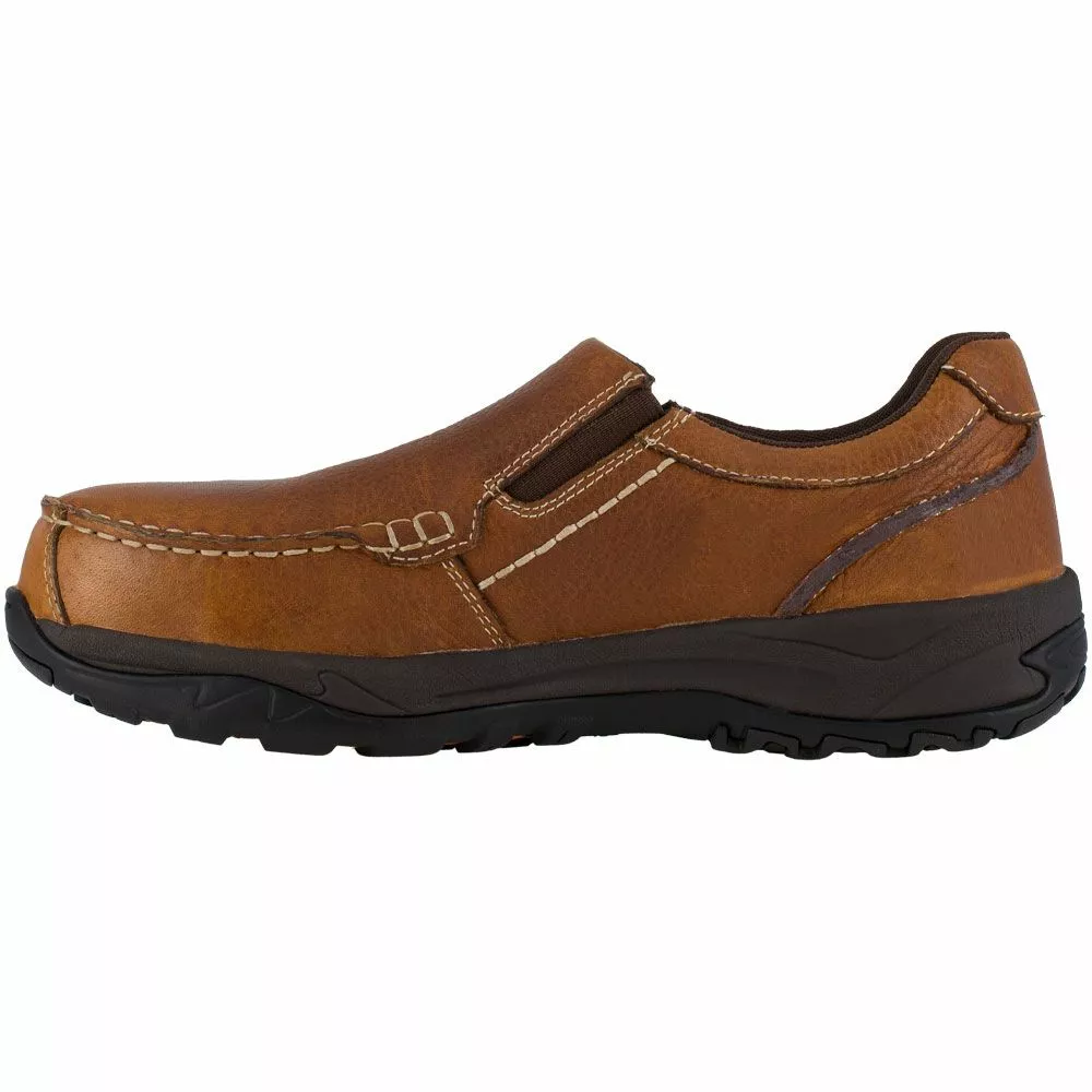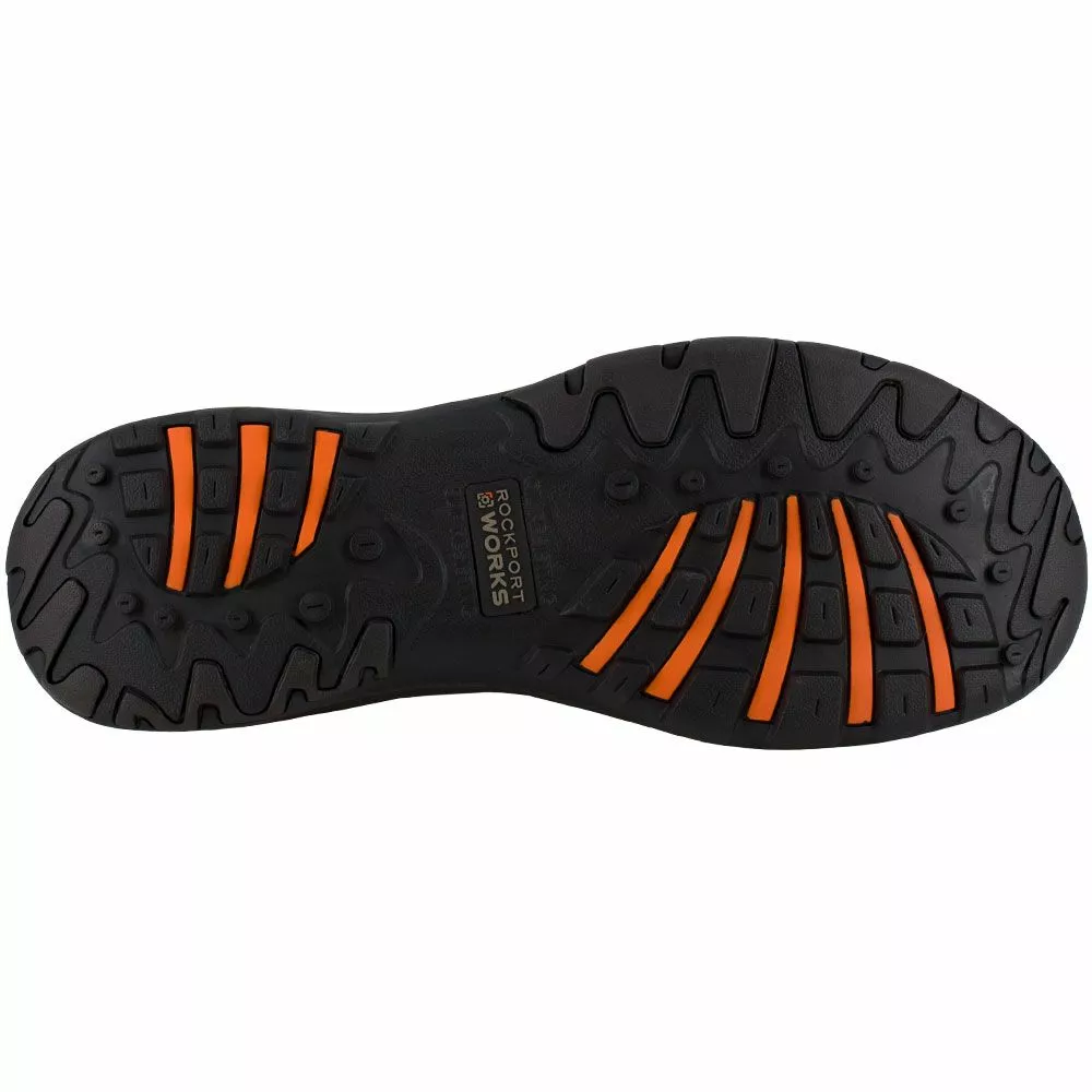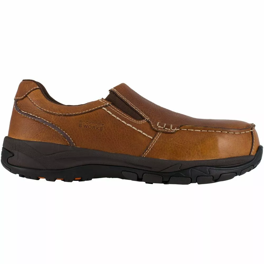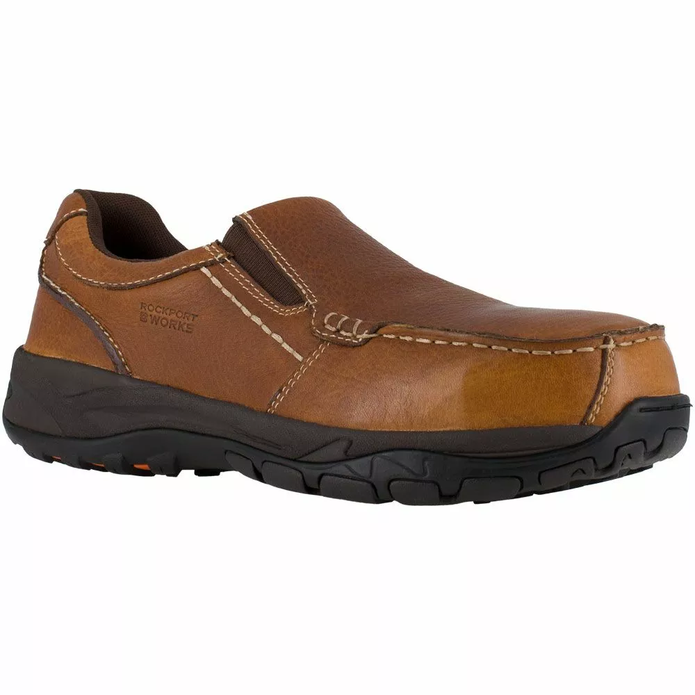 Rockport Works Rk6748 Mens Composite Toe Work Shoes. This men’s composite toe work shoe is a slip-on ideal for casual wear and also includes a variety of impressive safety features. Moisture-wicking suede nylon lining prevents perspiration build-up to keep your feet cool. Enjoy ample support with a removable EVA cushion insert with a heel stabilizer cup and an EVA rebounding heel pad. A rubber Eurotrak bottom has excellent traction on wet or oily surfaces.