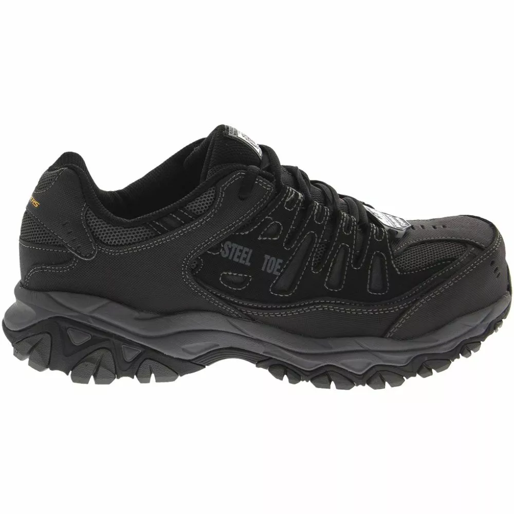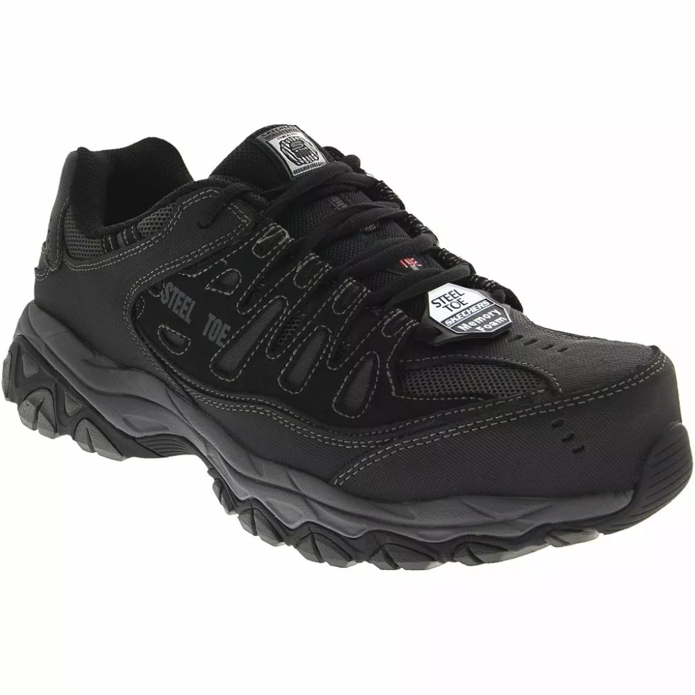 Skechers Work Cankton Mens Steel Toe Work Shoes. Enjoy protection, performance and comfort rolled into one in these mens steel toe work shoes. Rubber traction sole, leather upper and memory foam cushioning. Relaxed Fit® design.